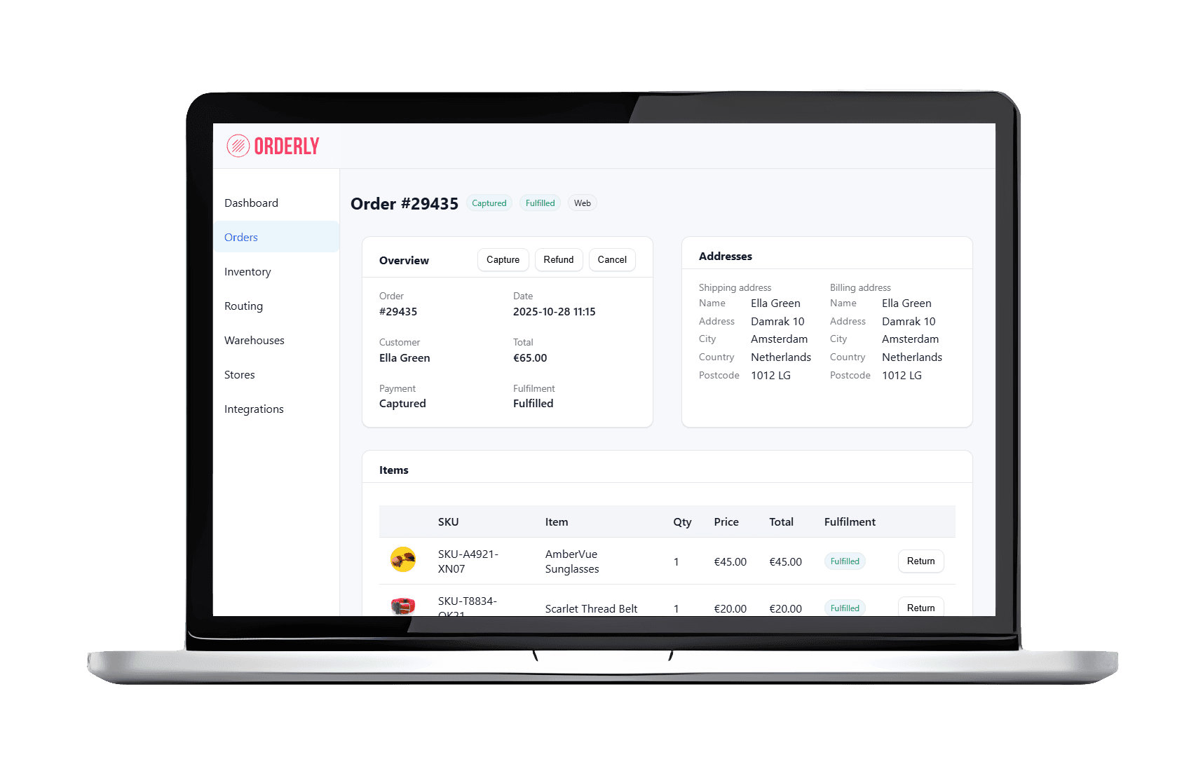 Every order, return, and fulfilment flows through one data model — regardless of where the sale happened or which warehouse ships it. No more reconciling tabs.